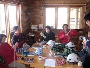 当日は石狩川の川風を受け、時折猛吹雪になる絶好の?コンディションの中、体育館とフィールドを使い分けて講習を行いました。体が冷えてリスクが高まるのではないかという心配をよそに、みなさん元気いっぱい果敢な若者で、突然荷重ビレイやスラスティングもこなす熱い2日間でした。