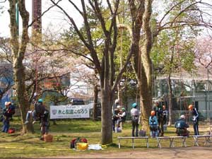 また、観桜会に訪れた多くの人たちは、子ども達が大人よりもスイスイ上っていくのには、大変に驚いていたようです。さらに、テレビ、新聞、雑誌社の取材もあり、対応に追われました。ますます、ツリーイングが宣伝された二日間でした。特に、最終日の二日目には、ゲストとして飛び入りで青森市の佐藤助役さんが体験されるなどで、大いに盛り上がりました。スタッフも連休の最中、子ども連れで参加されて、家族ぐるみで協力をしてくれました。その様子を、添付の写真で紹介します。 報告:北東北フ゛ロック |