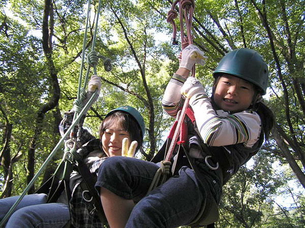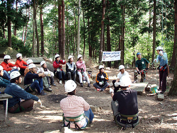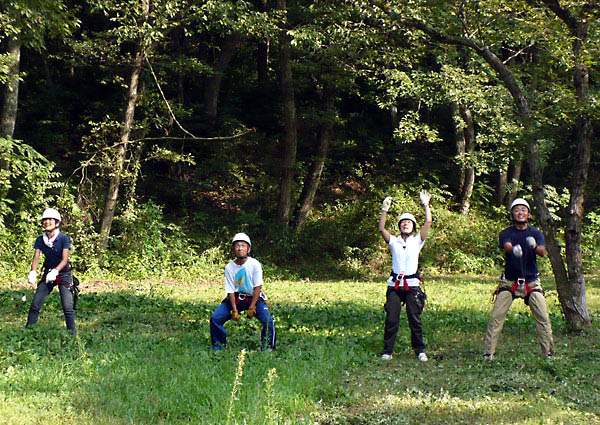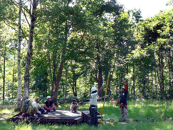 夏休みが始まったばかり、梅雨も明けないなかわずかな晴れた日を縫って7月25日に栃木県日光市川治温泉を拠点に活動しているNature-Planetさま主催の冒険キャンプのプログラムの一部として日光市今市少年自然の家にて行いました。 蝉の声と滝の音が聞こえる涼しい森の中、キャンプ2日目午後いっぱい使って19名の小学生と3名のリーダーが体験。 募集対象が栃木県日光市在住の小中学生であったため、山や川を駆け巡っているヤンチャ坊主たち、出てきた言葉が「木登り(ツリーイング)って以外にオモシロイじゃん!」でした。 またリーダーも栃木弁まるだしで話しているのを聞いているだけで笑いが出てきてしまいました。「・・・そんなもんでよかっぺよ。」 体験時間内に自分の目標地点まで達成できず悔し涙をながしている参加者が出たり、また登りたいので「今度は何時やるの?」と聞いてくるほどの盛況振りでした。 |