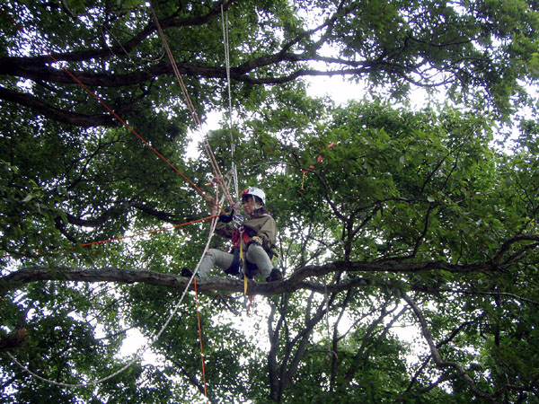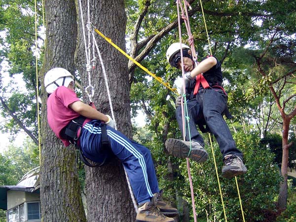 1日目は校内の立木で基礎練習を行ない、2日目には高校の裏山にある立派なケヤキにもトライしました。
