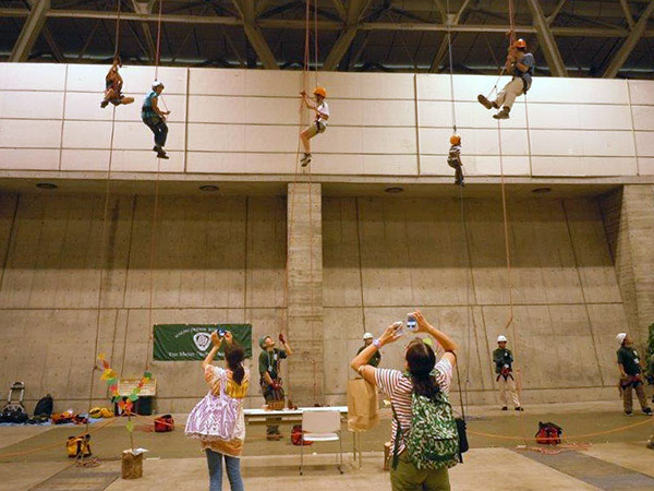 幕張での参加は今回で2回目ですが、今回もツリーイングを目当てに来場下さる方が多く見受けられ2日間で204名の方に体験して頂きました。 参加者の中には「この前はお世話になりました!」とスタッフに声をかけてくれた方や、前回も参加してツリーイングの感想を自身が書いた色紙を見つけ「私のだぁ~~!!」と喜んでいた方もいらっしゃいました。 子供達の参加はもとより今回は家族で楽しむ姿が多く見うけられ、ツリーイングの魅力が少しずつ広がっている様に感じられました。 報告:北関東ブロック 秋山 |